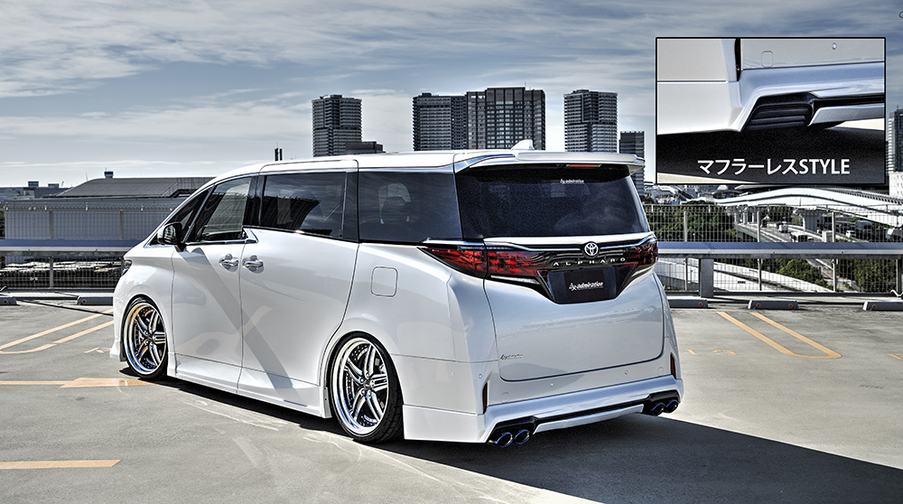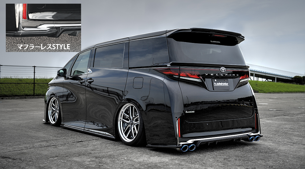 リヤのスタイルはアドミレイションの定番となる大口径左右デュアルマフラーとマフラーを必要としないスタイリッシュなデザインとしたマフラーレス仕様の2種類を設定しました。