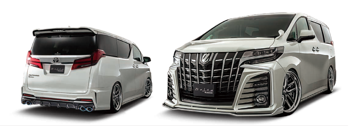 先進美と高級感のある造形美をコンセプトに進化する上質感を与えたフルバンパーエアロスタイル。 フロントバンパーはフォグ&LEDランプ周囲はFOGBOXスタイルとしベルタのアイデンティティでもあるスリットデザインを進化させ5本からのフィン構成でランプ類をフローティング風にセット、奥行き感を与えた立体的な造形美を魅せる。低重心フォルムと躍動感でヴェルファイアのアグレッシブな印象を高めます。 スリットタイプからディフューザータイプまでリヤバンパーはV1・V2・V3の3タイプを用意、圧倒的なワイド感を与えビッグバンパーによるサイズアップでハーフでは決して得られないボリューム感を演出。 また今やマストアイテムとなる専用左右4本出しエグゼクティブマフラーで更なる迫力と気品あるスタイルに纏め上げる。