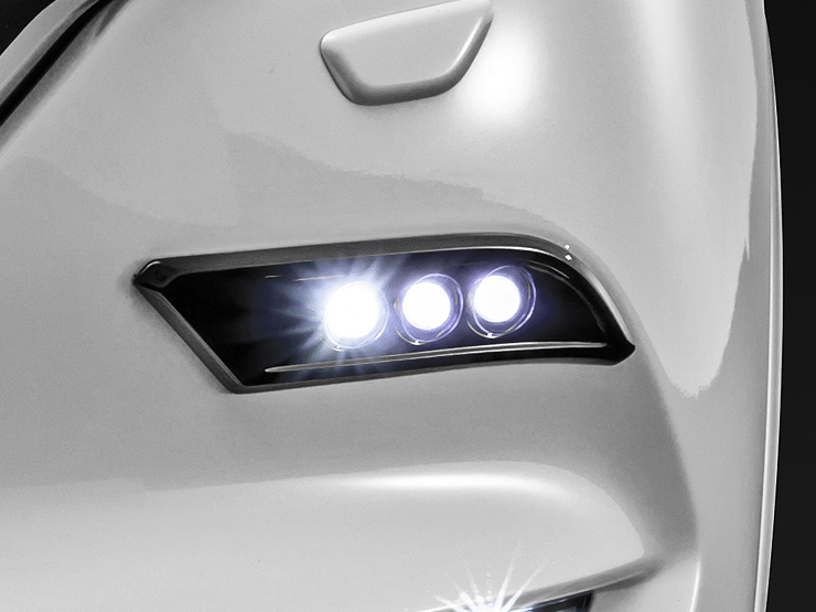 純正バンパーに対応し、3連スポットの連続した輝きがフロントフェイスの存在感を一層引き立てます。