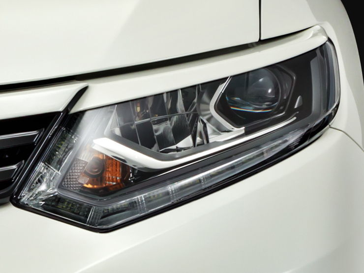 ヘッドライトを引き締めエクストレイルの特徴でもあるシグネチャーランプをより強調し、フロントフェイスに存在感あるアクセントを与えます。 またフェイスグリルとの同時装着で連続したデザインの流れでより精悍な表情へと高めてくれます。