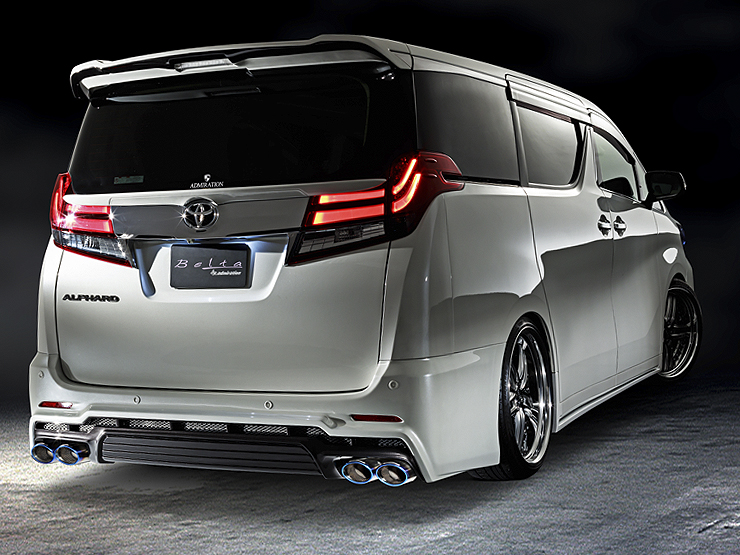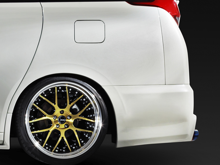 圧倒的なワイド感を与える7連スリットダクトが特徴的なリヤバンパー。後方へのサイズアップによりハーフでは決して得られないボリューム感を演出。センター部は4面構成による段差でデザインの質感を高め、マフラー部周囲まで立体的な流麗な造形美で高級感を演出。また今やマストアイテムとなる専用左右4本出しエグゼクティブマフラーで更なる迫力と気品あるスタイルに纏め上げる。