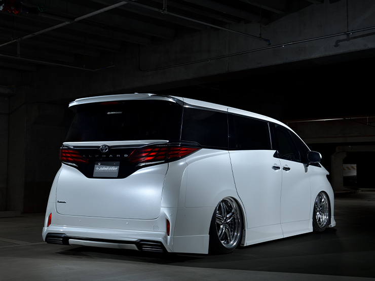 ボディーラインを継承した一体感ある造形美で、マフラー部をマフラーレス3段デザインでアクセントを与え、フロント同様センター部をフローティングデザインとし、シンプルで美しいラインを演出したリヤハーフスポイラー。