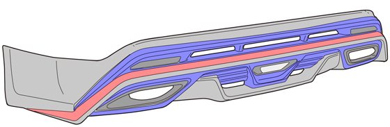 ダクトを随所に設け、左右に埋め込まれるリフレクター、2段の段差からスカート状にワイド感を強調するデザイン。センターは立体感を与えたボックス形状で作り込まれた造形美の中にリヤフォグをインストール。マフラー部は本物志向に拘った、LEXUS LS後期純正マフラーフィニッシャーを採用。リヤハーフにあますことなく特徴を詰め込んだ贅沢かつ刺激的な存在感を与えてくれます。塗り分け塗装によるアレンジでインパクトある印象を与える事も可能。妥協をしないエアロスタイルを追求したアドミレイションの先進美あふれる最新50プリウス専用 リヤハーフスポイラー