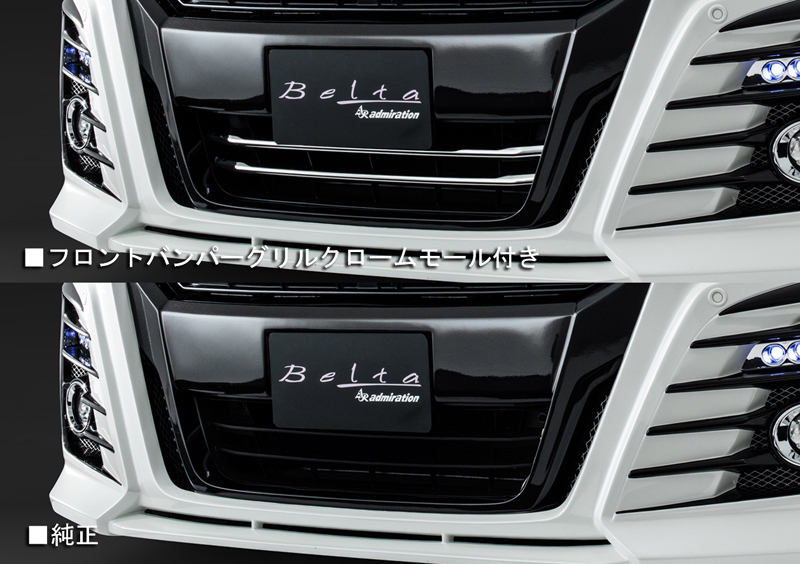 フォグ&LEDランプ周りはベルタのアイデンティティでもあるスリットデザインを進化させ4本からのフィン構成でランプ類をフローティング風にセット、奥行き感を与えた立体的な造形美を魅せる。ボトム部分は3連スリットダクトで低重心フォルムと躍動感でヴェルファイアのアグレッシブな印象を高めます。ロアグリルは純正を流用することで純正の質感の良さを残しつつ、両サイドの縦ダクトで存在感を演出します。汎用メッキパーツを流用することでデモカーのように高級感をさらに高める事が出来ます